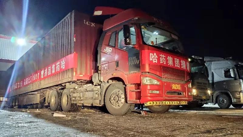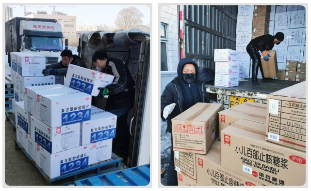 上午9時許,哈藥三精、哈藥六廠、中藥二廠、哈藥總廠、世一堂制藥廠、三精四廠及哈藥生物裝運物資的員工冒著寒冷的天氣,認真核對批號、數(shù)量,最短時間完成裝貨。21時許,滿載哈藥集團捐贈物資的車輛在松北區(qū)順豐醫(yī)藥集散點集結完畢,奔赴武漢。